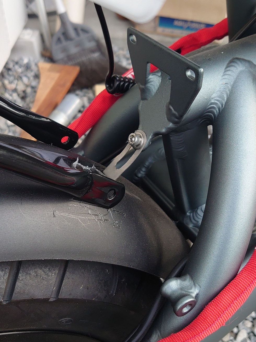 そのままだとナンバープレートが隠れてしまい、道交法上マズいのでナンバープレート類を後に移設。