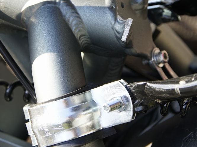 丁度バイクの丸パイプフレームの幅ジャストだったので、フレームにM8の穴を開けてガッツリ固定する。