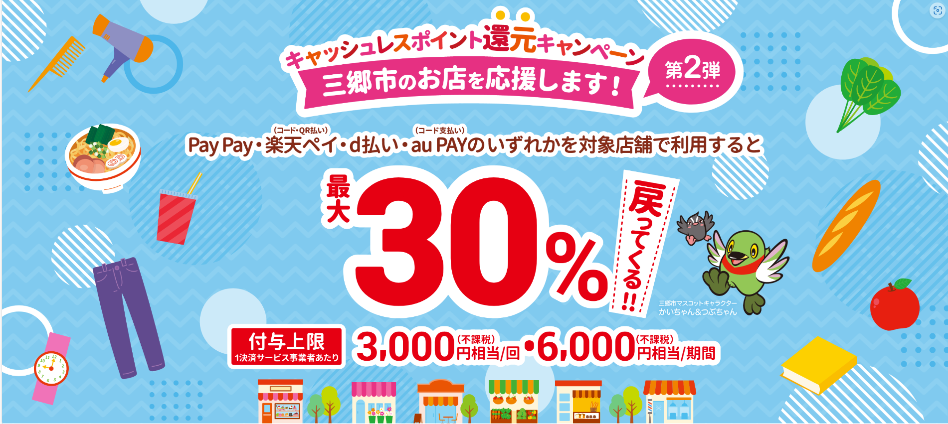 キャッシュレスポイント還元キャンペーン三郷市のお店を応援します!【第2弾】PayPay/楽天ペイ/d払い/auPAYで最大30%還元キャンペーンが三郷市のお店対象でスタート。
